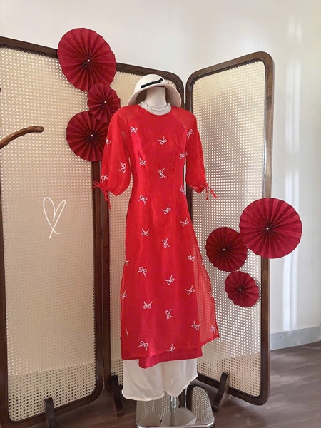 Set áo dài nữ thiết kế tơ voan màu đỏ thêu nơ trắng tay lửng thắt nơ phối quần suông kem