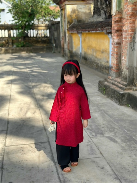 Áo dài bé gái thiết kế cổ cao gấm hoa đính nơ tay dài phối quần lụa đen