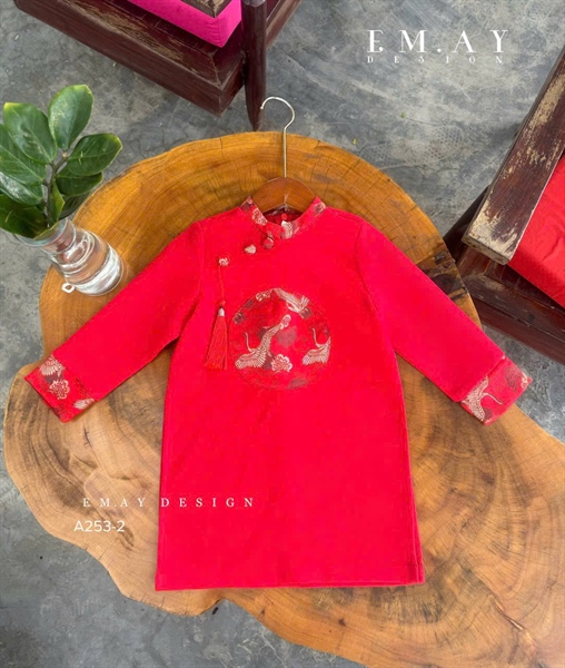 Áo dài bé trai thiết kế màu đỏ viền cổ và tay áo phối hình thêu chim hạc và hàng nút bọc