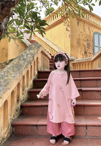 Set áo dài lụa hồng nhạt bé gái thiết kế cổ tròn đính nơ ruy băng form suông phối quần màu hồng đậm kèm băng đô lụa nhún
