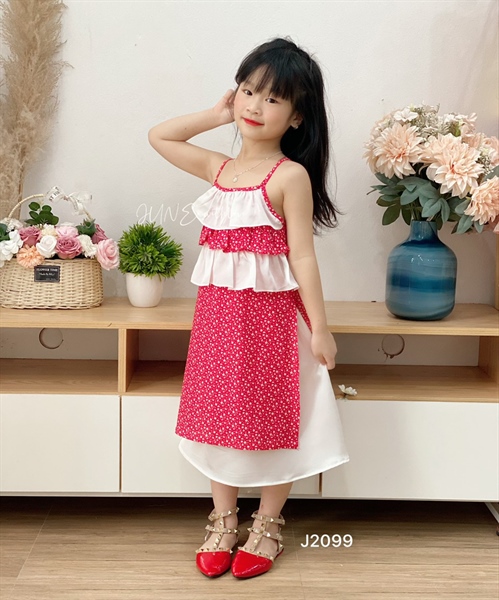 Set áo dài yếm hoa đỏ phối bèo trắng kèm chân váy