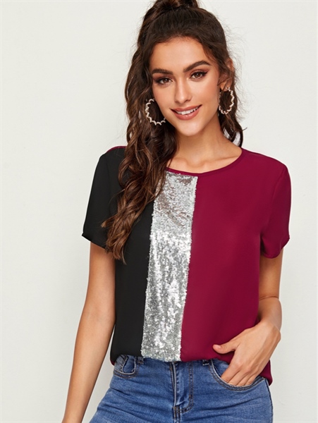 Áo blouse nữ cổ tròn sequin bạc lấp lánh phối màu đỏ đen