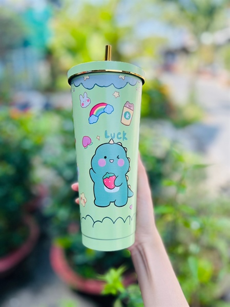 Ly giữ nhiệt 750ml hình khủng long cute màu xanh bơ kèm ống hút và cây rửa ống hút