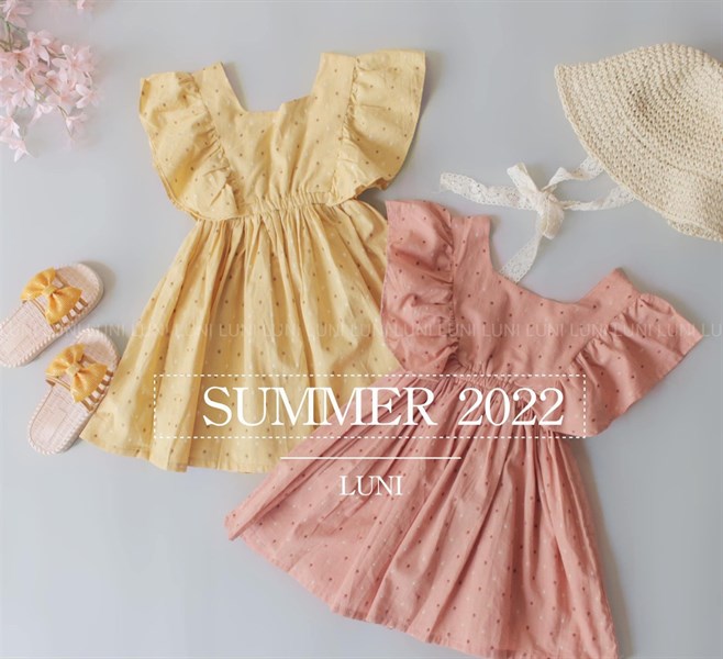 Đầm bé gái chấm bi tay cánh tiên bo thun eo nơ lưng