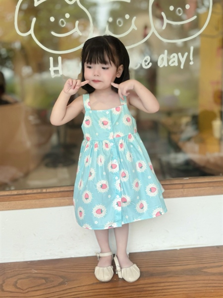 Đầm bé gái cổ vuông sát nách phối hàng nút giữa và 2 túi