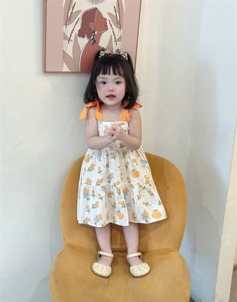 Đầm bé gái hình cute dây cột nơ vai phối màu sắc