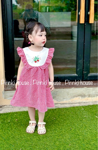 Đầm bé gái kẻ caro đỏ-trắng phối ngực áo trắng thêu hoạ tiết dâu tây