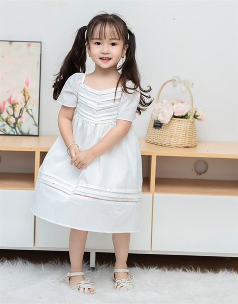 Đầm bé gái linen trắng thiết kế xếp ply ngực cutout