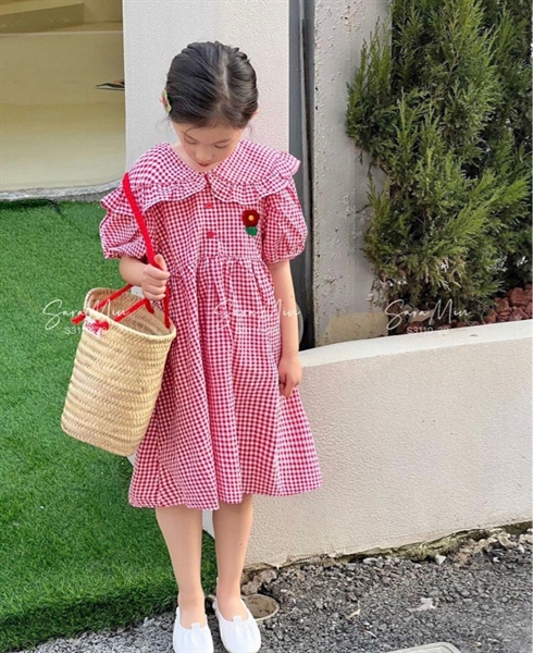 Đầm bé gái thiết kế caro đỏ cổ thuỷ thủ viền bèo đính hoa