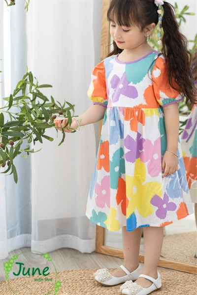 Đầm bé gái thiết kế hoa sắc màu viền tím phối dây nơ lưng