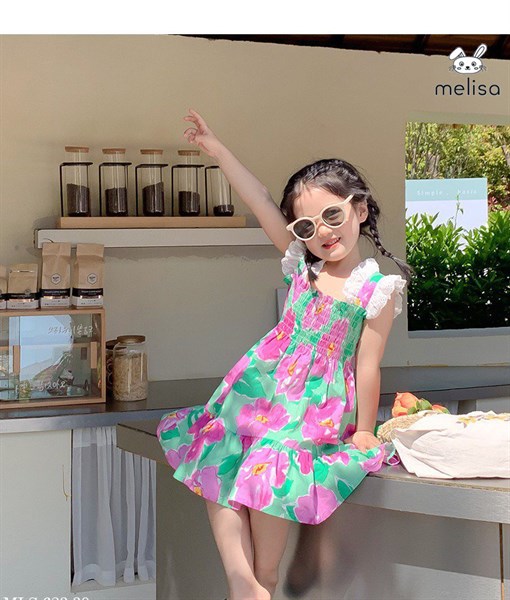 Đầm bé gái thiết kế smock ngực hoa hồng tím xanh lá viền ren trắng