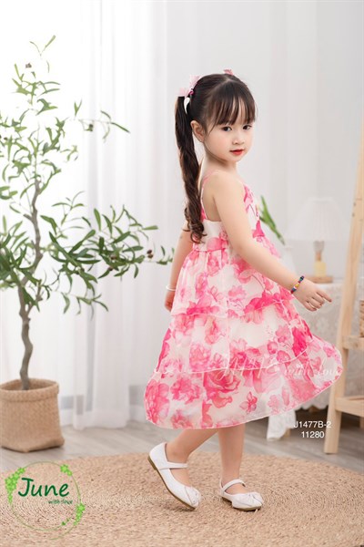Đầm bé gái thiết kế voan hoa bồng bềnh dây ngang lưng