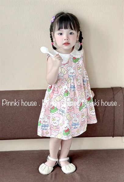 Đầm bé gái thỏ cute phối cổ sen trắng viền