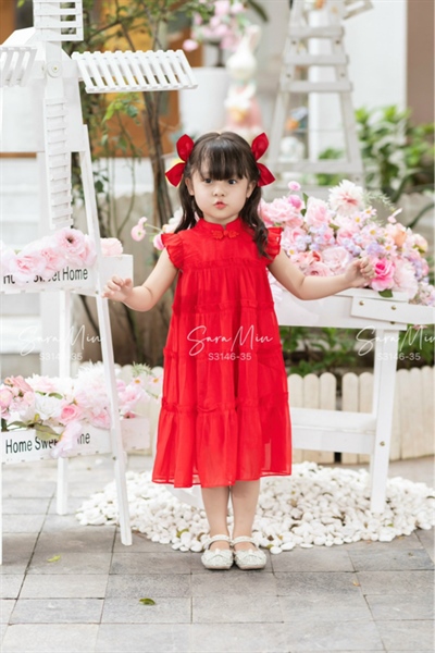 Đầm bé gái tơ óng thiết kế bèo tầng cổ tàu cách điệu cột nơ lưng