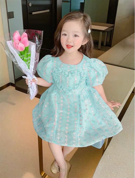 Đầm công chúa bé gái thiết kế tơ hoa tay phồng trái tim sọc nhũ lấp lánh