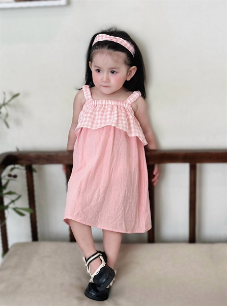 Đầm dây bé gái hồng cam nhạt phối caro tầng nhún thun ngực và dây áo