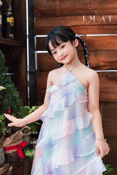 Đầm yếm bé gái thiết kế tơ ánh màu loang hồng tím xanh phối bèo tầng xéo