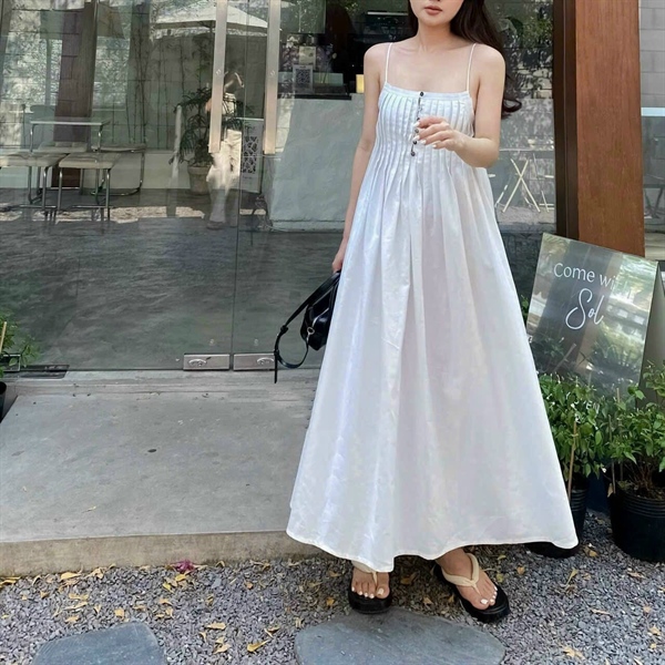 Đầm dây nữ linen maxi xếp ply ngực phối nút form suông