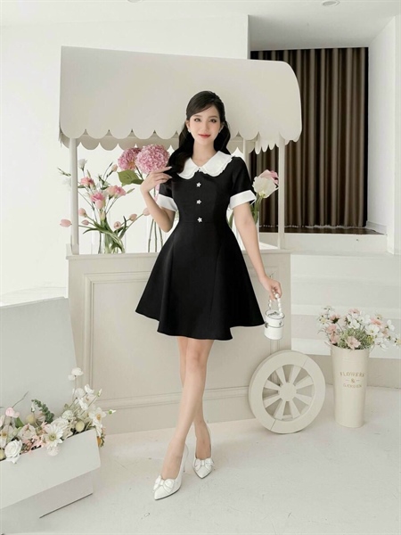 Đầm đen nữ thiết kế cổ sen viền bèo trắng phối hàng nút ngôi sao đính đá