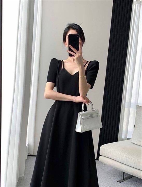 Đầm đen xoè nữ thiết kế rớt vai midi