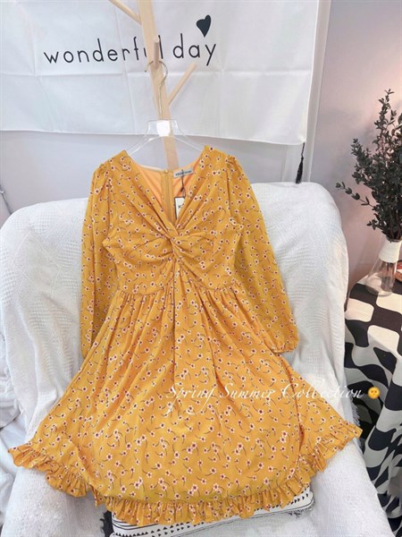 Đầm hoa nữ babydoll thiết kế tay dài xoắn ngực