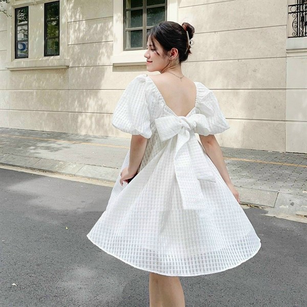 Đầm nữ babydoll thiết kế tay bồng phối nơ sau lưng