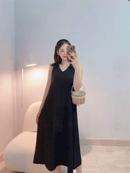 Đầm nữ thiết kế form suông tơ xước cổ V nơ vai