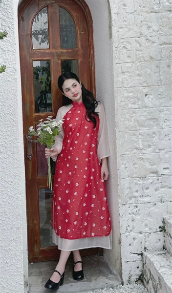 Đầm nữ thiết kế kiểu áo dài cách tân form suông hoa nhí trắng nền đỏ phối tay áo và chân váy tơ voan trắng