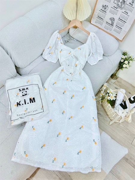 Đầm nữ thiết kế midi hoa trắng nhún ngực rút dây cutout