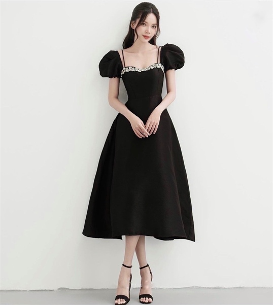 Đầm nữ thiết kế midi màu đen đính đá viền ngực tay búp