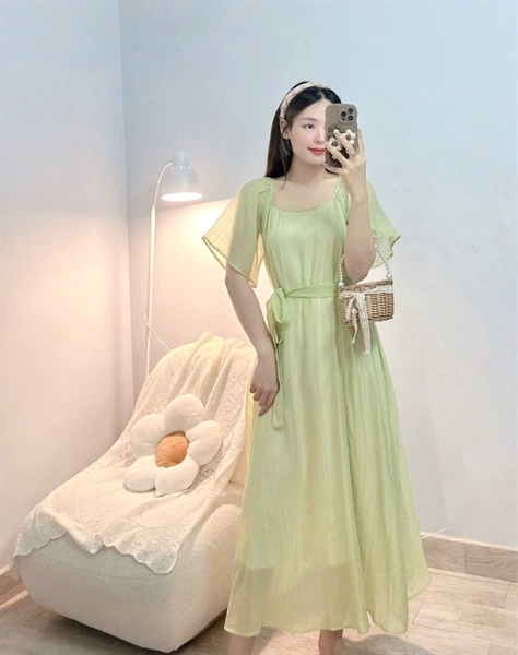 Đầm nữ thiết kế tơ voan cổ vuông tay xoè form suông kèm dây cột eo