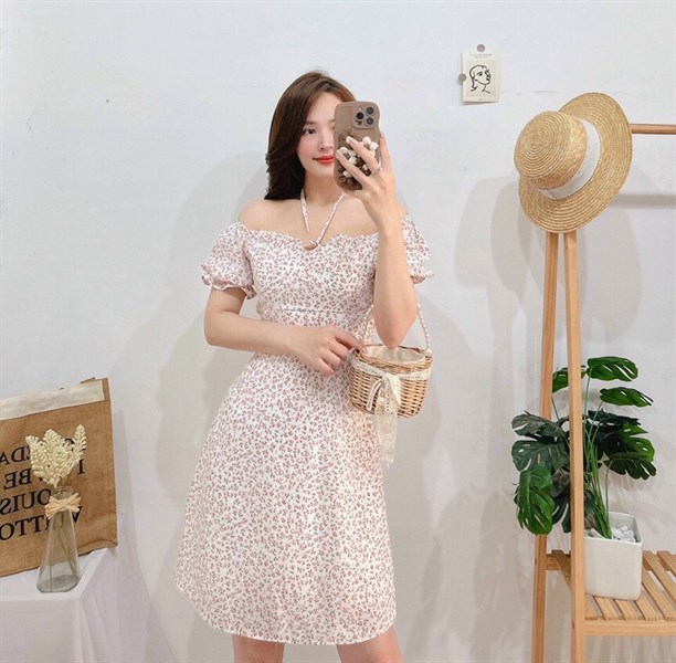 Đầm thiết kế nữ hoa nhí bo tay cột dây cổ