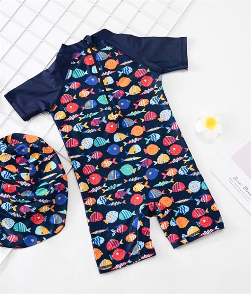 Đồ bơi trẻ em liền thân kèm nón hình cá nhiều màu phối tay raplan và dây kéo bản to