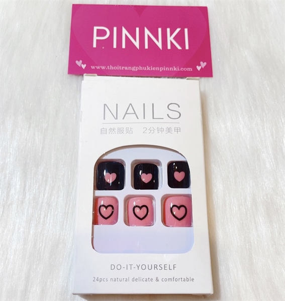 Set 24 nails vuông ngắn dán móng chân phối màu hồng - đen trái tim cute kèm keo dán