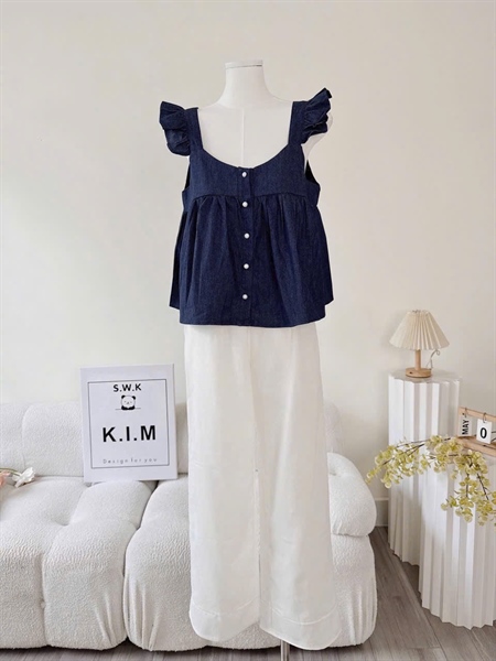 Set nữ thiết kế áo babydoll jean tay cánh tiên phối quần suông linen trắng kem