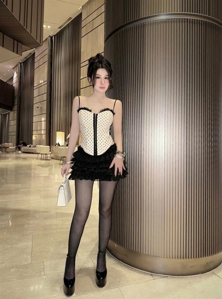 Set nữ thiết kế áo crop 2 dây chấm bi cúp ngực viền ren đen phối chân váy đen tầng