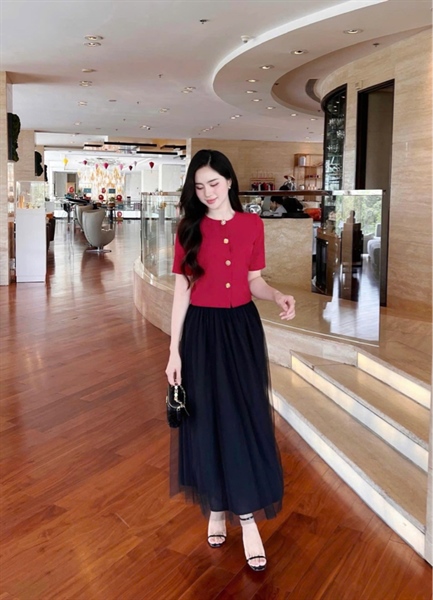 Set nữ thiết kế áo dạ đỏ cổ tròn tay ngắn phối chân váy midi voan đen