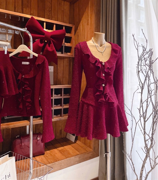 Set nữ thiết kế áo đỏ bèo tay dài phối chân váy xoè màu đỏ