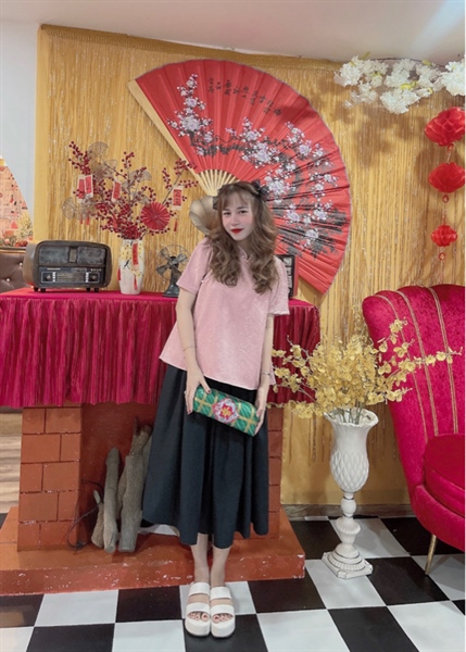 Set nữ thiết kế áo gấm form A đính nút ngọc phối chân váy đen xếp xoè