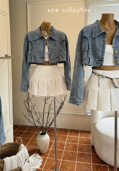 Set nữ thiết kế áo khoác jean kèm áo crop dây trắng phối chân váy xếp ply trắng