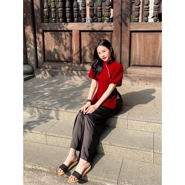 Set nữ thiết kế áo nhung đỏ tay phồng đính hàng ngọc phối quần suông lụa đen