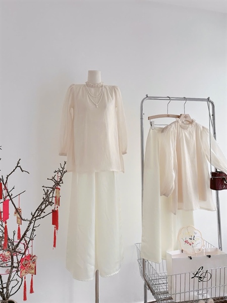 Set nữ thiết kế áo tơ nude cổ bèo bo tay phối quần suông kem