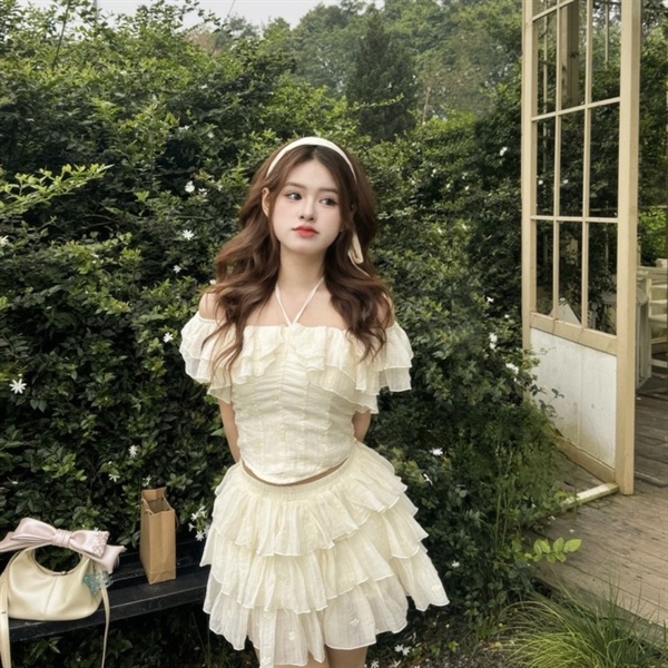 Set nữ tơ gân voan hoa thiết kế áo vàng kem trễ vai bo thun phối váy quần xoè tầng