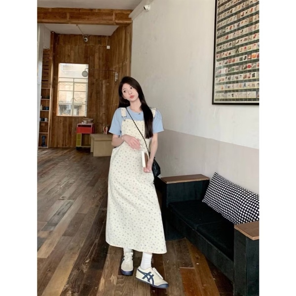 Set nữ váy yếm hoa dài phối áo thun màu