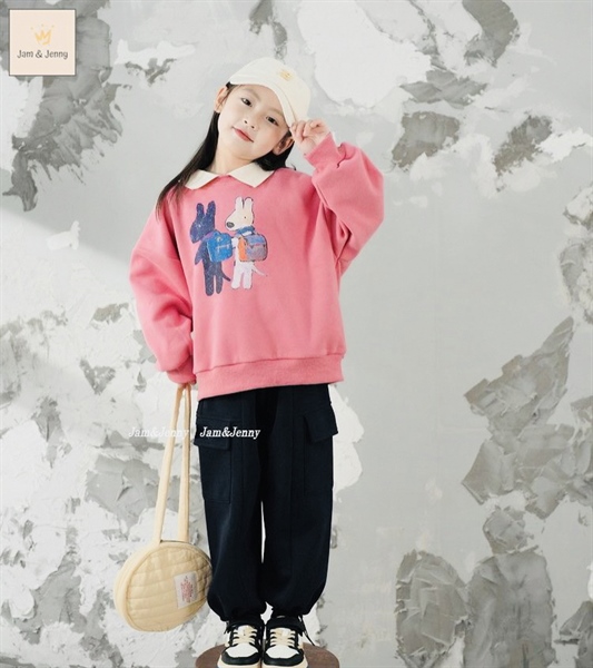 Set áo nỉ hồng cổ sơmi trắng hình 2 chú cún phối quần đen túi hộp bo gấu