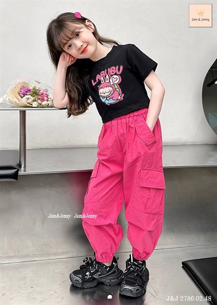 Set bé gái áo crop đen Lalubu phối quần túi hộp hồng đậm