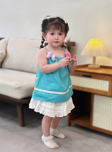 Set bé gái áo dây xanh đính nơ hồng tím dây áo phối váy quần ren trắng