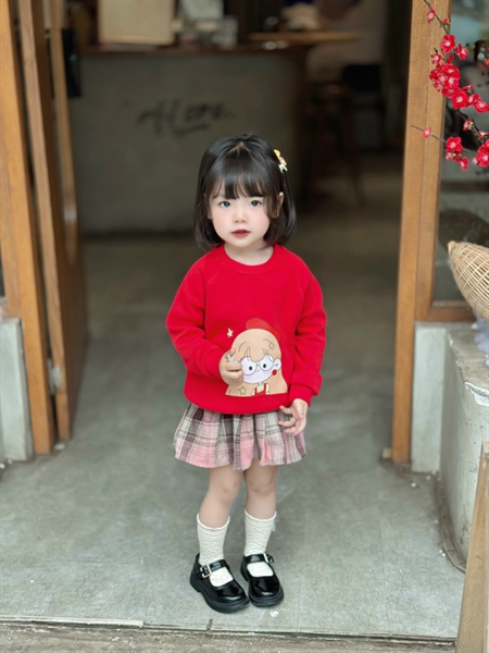 Set bé gái áo thun nỉ đỏ hình cô gái đeo kính cute phối váy quần caro hồng đất nhạt