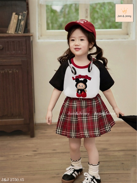 Set bé gái áo thun trắng Lalubu phối tay áo đen và viền cổ đỏ mix váy quần caro đỏ sẫm