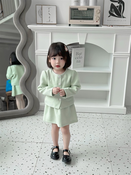 Set bé gái dạ màu xanh mint pastel tiểu thư áo khoác 2 túi đính nơ phối chân váy xoè